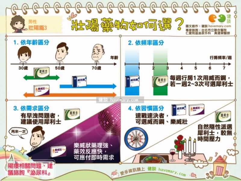 - 以年齡層區分-若為50歲以上慢性病好發族群,建議可選擇威而鋼,若為30至50的年輕族群,可選擇長效性的犀利士,年長者反而不建議使用犀利士,以免造成健康疑慮;而樂威壯則不限年齡使用。
