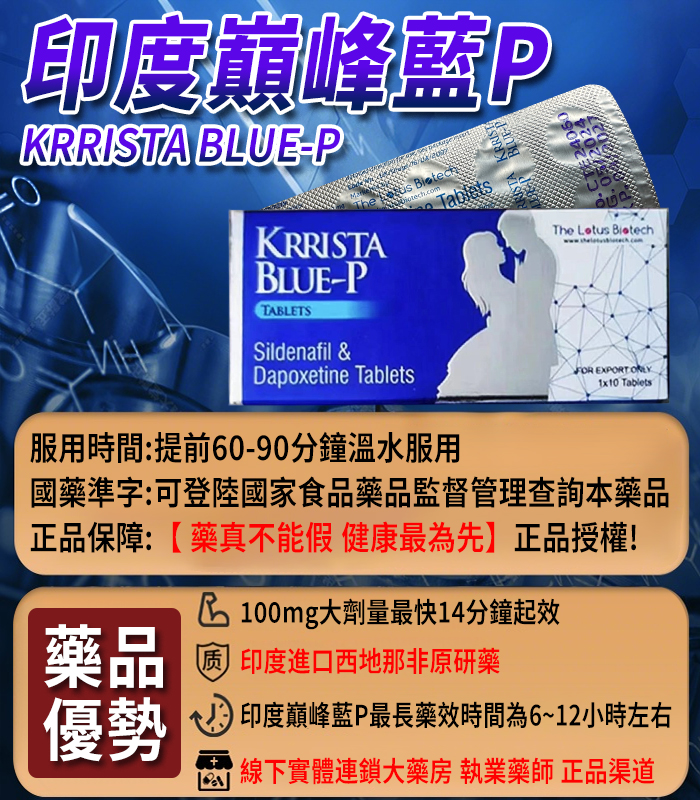 在追求極致性愛表現的男性族群中,「印度巔峰藍P(KRRISTA BLUE-P)」堪稱一款高效能的熱門選擇。結合助勃成分西地那非(Viagra)與延時成分達泊西汀(Priligy),一次解決勃起障礙與早洩困擾,帶來雙重保障。不論是應對硬度不足還是快速射精,藍P雙效片都能助你找回掌控力。本文將完整介紹其成分功效、使用方法、副作用與注意事項,讓你在使用前全面了解、安心入手。