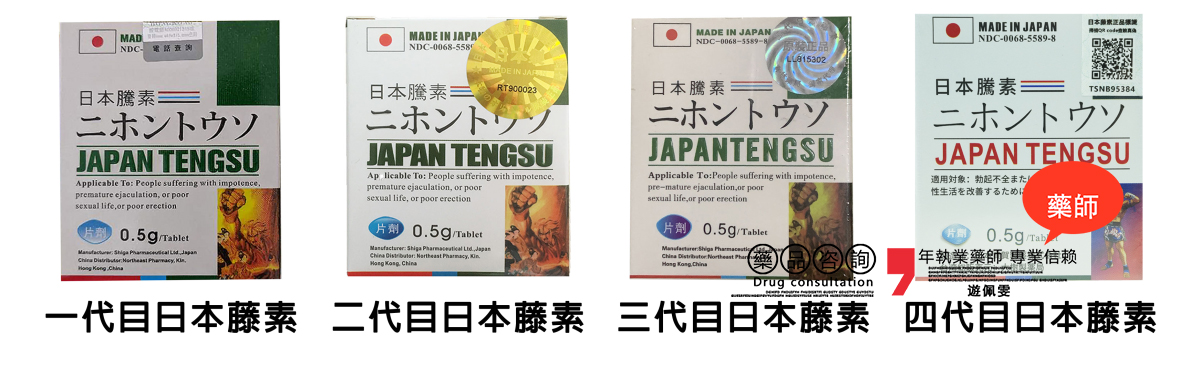 在過去幾年,市面上售賣的都是第一代/二代日本藤素,因為仿冒品過多,後續升級為第三代日本藤素,直接在防偽標籤上刻印了防偽碼,每一盒藤素僅有一個可查驗的防偽碼,一碼一盒一查。才得以杜絕偽藥!